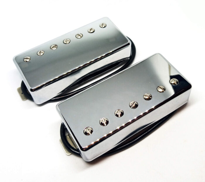 Set di pickup Humbucker artigianali Made in Italy IUSO HBA57 per chitarra 7 corde. Bobine in ABS di colore nero e barre magnetiche in Alnico 5. Possibilità di aggiungere anche la cover cromata. Filo a 4 conduttori per poter splittare entrambe le bobine e usare i pickups in modalità single coil o humbucker.
